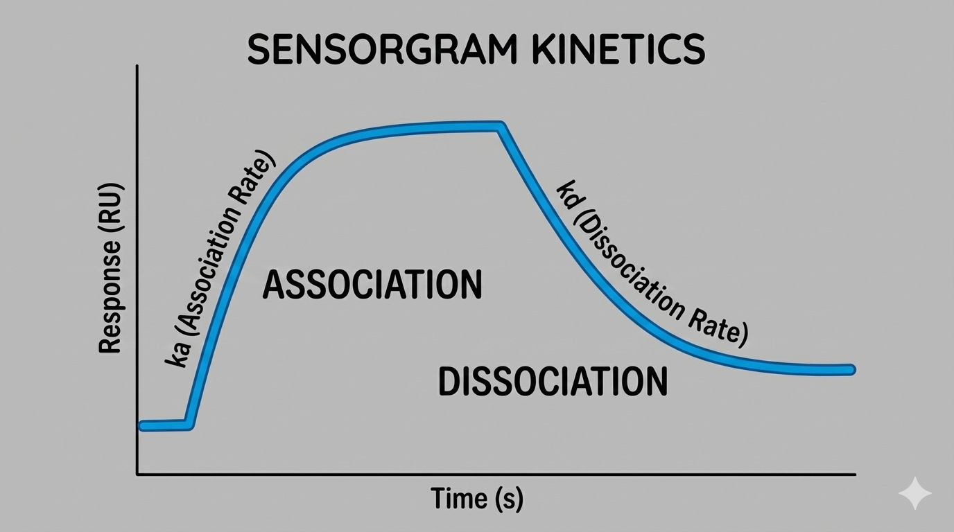 - 친화도 평가 (Affinity, KD): 반응이 평형에 도달했을 때의 데이터를 바탕으로 분자가 얼마나 강하게 결합하는지(KD = kd / ka)를 계산.