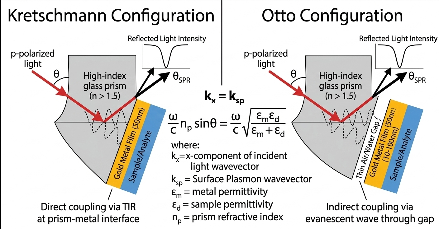 SPR 장치 구조는 플라즈몬을 여기시키는 방식에 따라 나뉩니다. 상용화된 대부분의 바이오센서는 실험이 안정적인 Kretschmann 방식을 채택하고 있습니다.